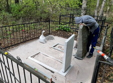 Клиент заказал достаточно экономное покрытие серой гранитной крошкой. Для того, чтобы трава в дальнейшем не прорастала, мы затянули территорию места захоронения (а также пространство внутри цветников) геотекстилем. Параллельно с этим по периметру участка установили железную полосу, препятствующую выпадению крошки за территорию могилы.