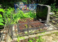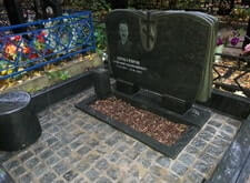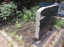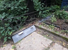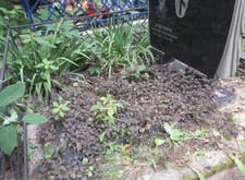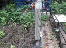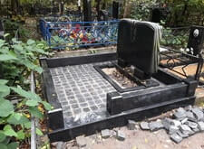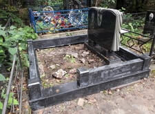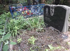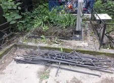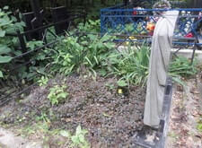 Покосившийся памятник, проржавевшая ограда, сорняки |