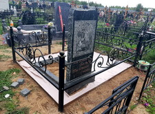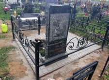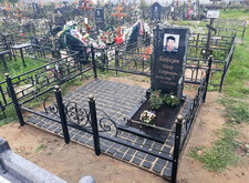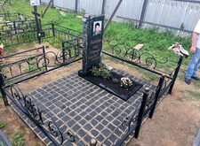 Брусчатку замываем водой: пескобетон размокает, превращаясь в надёжный скрепляющий раствор. На этом наши работы на могиле закончены, клиент выразил благодарность за оперативность и качество оказанных услуг.